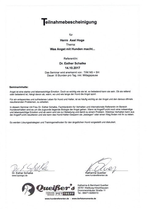 • Zertefizierter Kynophobietherapeut S.D.T.S®